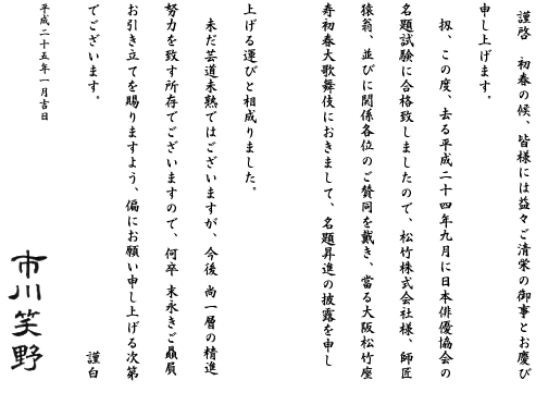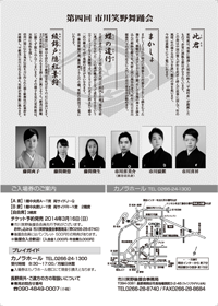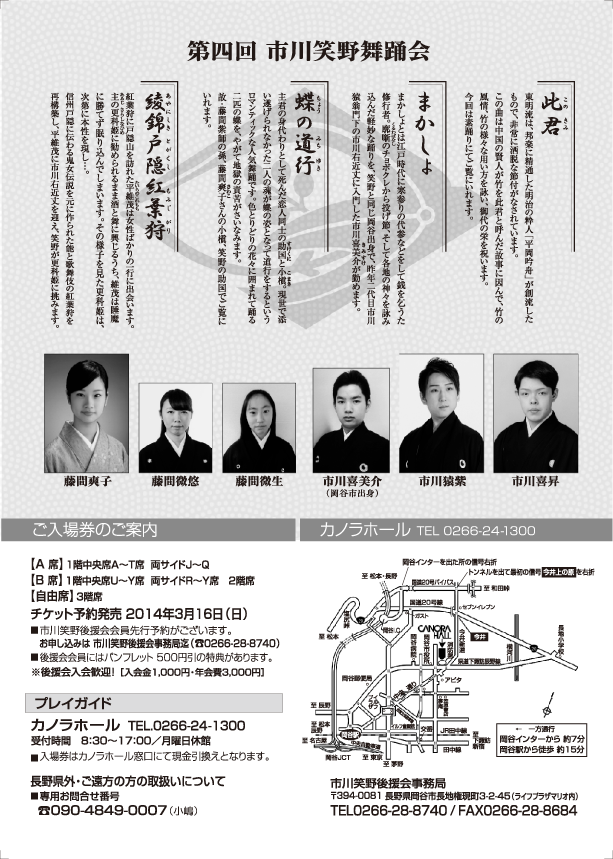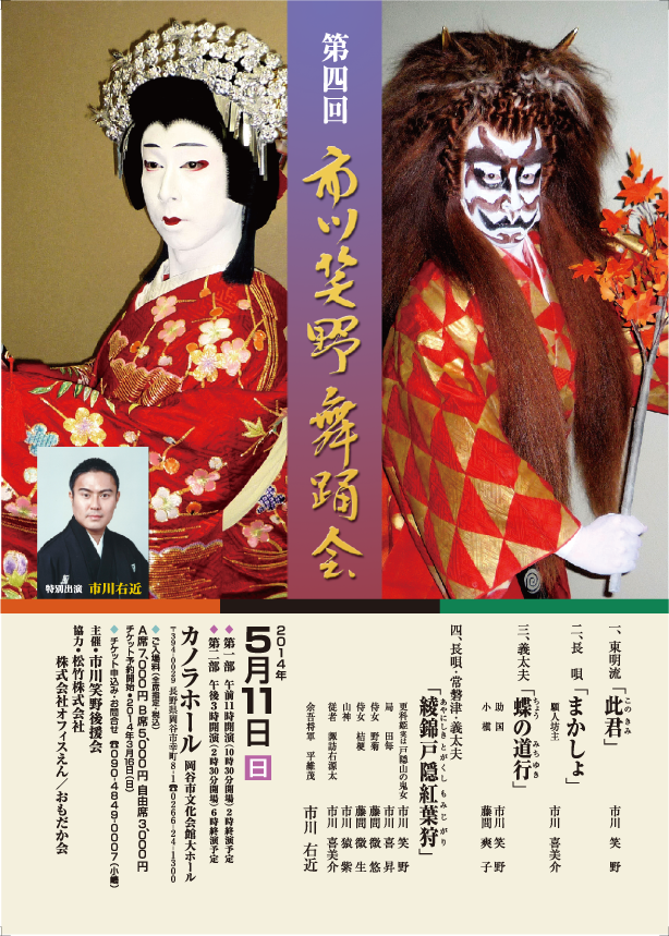 開催日時:2014年5月11日(日) 開催場所:岡谷市文化会館大ホール カノラホール ご入場料:A席 7,000円 B席 5,000円 自由席 3,000円 チケット予約開始:2014年3月16日(日) チケットお申込み・お問い合わせ:TEL 090-4849-0007(小嶋) 主催:市川笑野後援会 協力:松竹株式会社 株式会社オフィスえん/おもだか会 演目 ・此君 ・まかしょ ・蝶の道行 ・綾錦戸隠紅葉狩